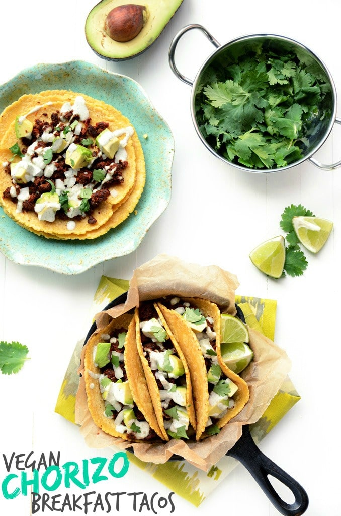 These vegan chorizo breakfast tacos are spicy, savory, warm, filling, and incredibly satisfying. The chorizo itself is made from a combination of grated cauliflower, sun-dried tomatoes, and a handful of spices. For real.