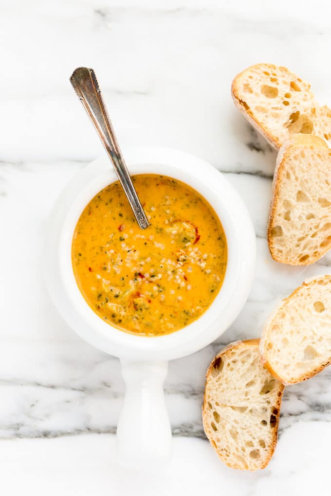 YUM! This soup is so creamy, cheesy, and delicious! The roasted red peppers add such a nice flavour to the cheese sauce. Thank you for the recipe, I will definitely make it again!