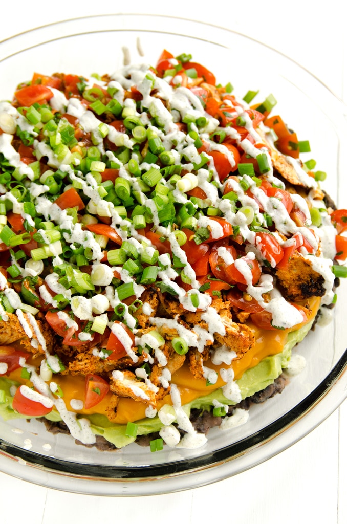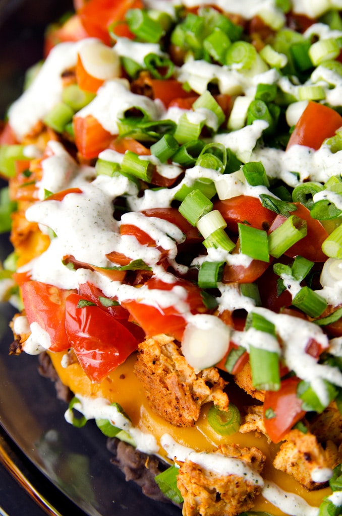 Refried black beans, avocado mayo, sweet potato nacho cheese, shredded vegan chick'n, fresh pico de gallo, zesty sliced green onions, and tangy hemp seed sour cream are piled high in this 7-layer vegan nacho dip.