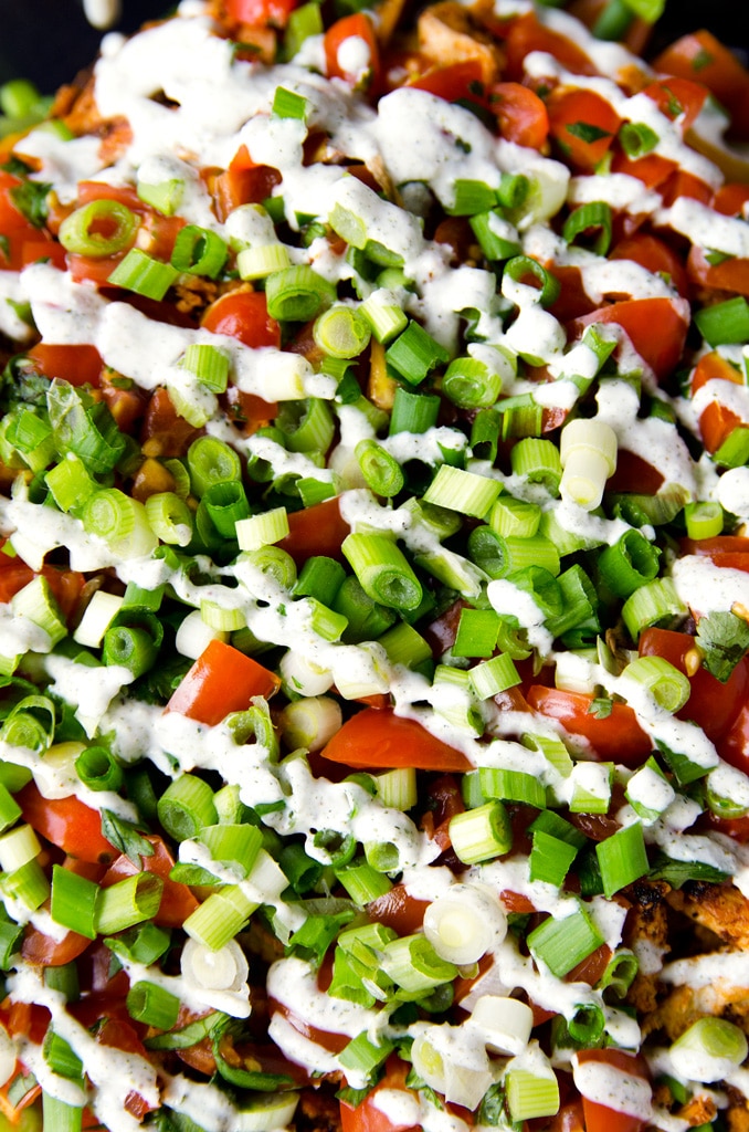The second layer is an avocado mayo, which is just avocado, a splash of lime juice, a clove of garlic, and a pinch of salt that's been processed into a smooth cream in a food processor. The third layer is this sweet potato nacho cheese, which is brightly-hued, plant-based, and packed with Vitamin A thanks to the steamed sweet potatoes. The fourth layer is the seasoned and shredded chick'n. The fifth layer is a quick and easy pico de gallo that you'll make by combining quartered cherry tomatoes, cilantro, and sea salt. The sixth layer is a quick sprinkling of sliced scallions. And the seventh and final layer is a drizzle of hemp seed sour cream that packs a kick of omega-3, omega-6, and complete protein.