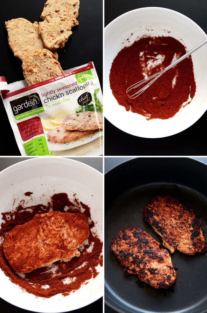 - In a shallow bowl, whisk together the smoked paprika and chili powder. Add the chick'n scallopini to the bowl and toss to coat in the mixture.