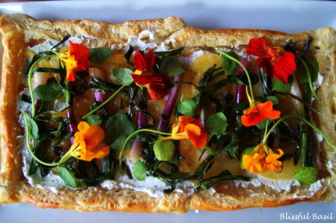 6. Spoon goat cheese atop cooked puff pastry. Gently spread the cheese, being careful not to break apart the top of the pastry, until the tart is evenly coated. Arrange the golden tomatoes and spring onions and garnish with watercress leaves and edible flowers. Serve immediately and enjoy!