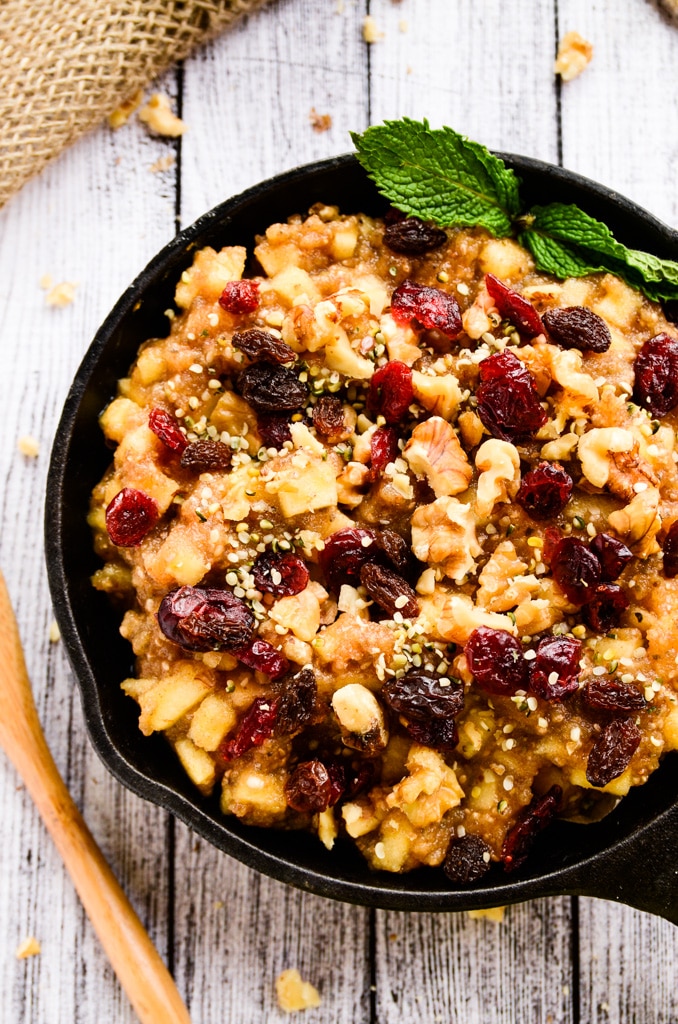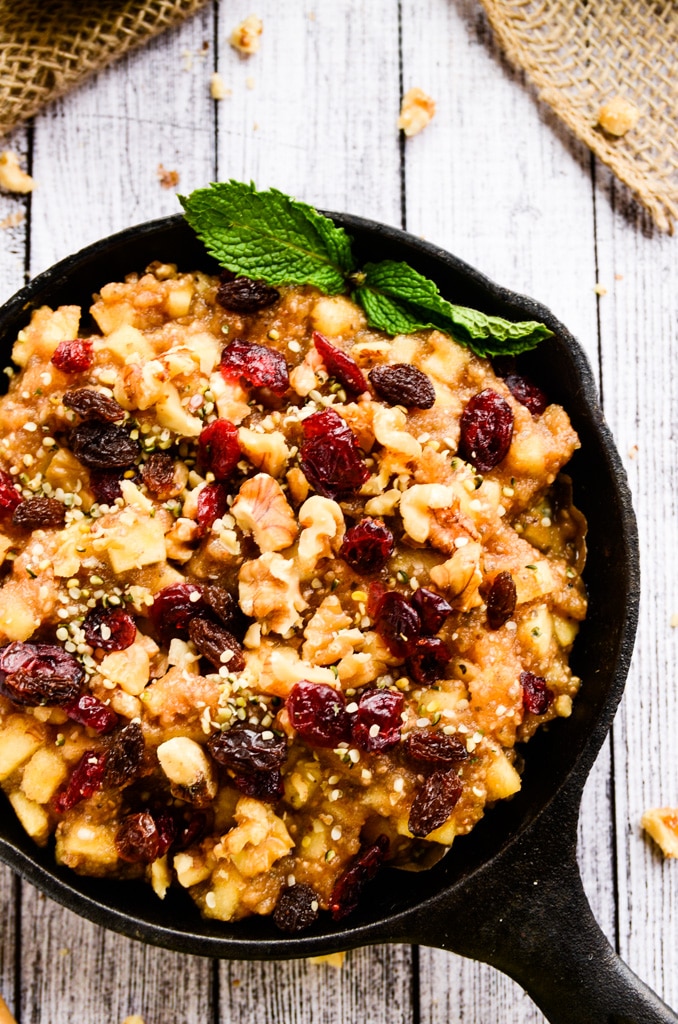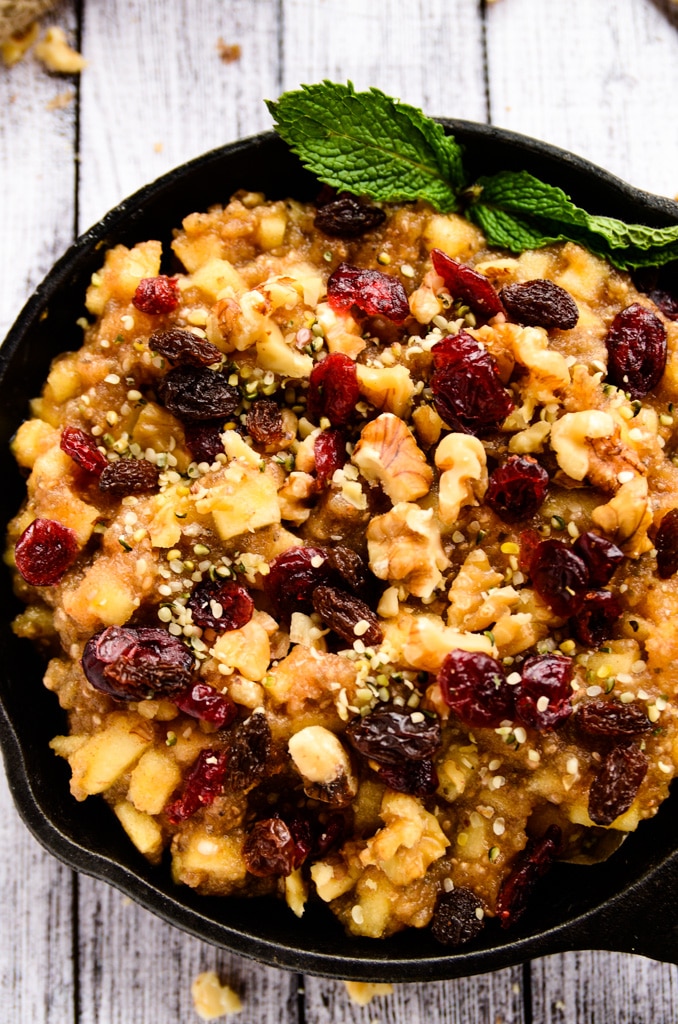 Although this dish looks like a big bowl of oatmeal, there isn't an oat or a grain in sight. Honeycrisp apples, medjool dates, cinnamon, and nutmeg are tossed into a food processor and whirled to sweet perfection. Then, another honeycrisp apple is finely diced and stirred into the apple-date mixture along with two tablespoons of chia seeds. After chilling in the refrigerator for at least one hour (or overnight), the apple-cinnamon deliciousness is scooped into two bowls and topped with raw walnuts, raisins, dried cranberries, and hemp seeds.