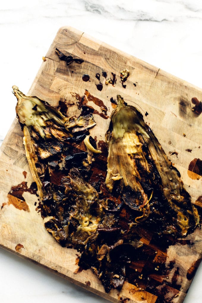 Once the eggplant is thoroughly charred and ultra tender, you'll plop it in a bowl to let it cool and steam itself a bit more.