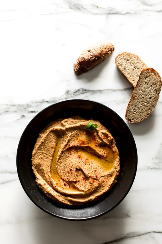 You'll add the eggplant to a food processor along with cannellini beans, tahini, lemon juice, smoked paprika, garlic, and sea salt. Then, process until quite smooth and creamy. Scoop it into a dish, garnish as desired, and serve it up alongside seeded bread, pita chips, veggies, tortilla chips, warm naan, etc.