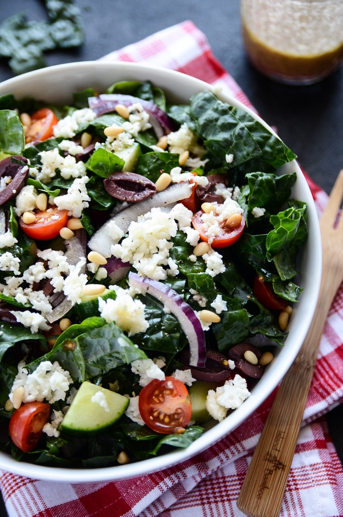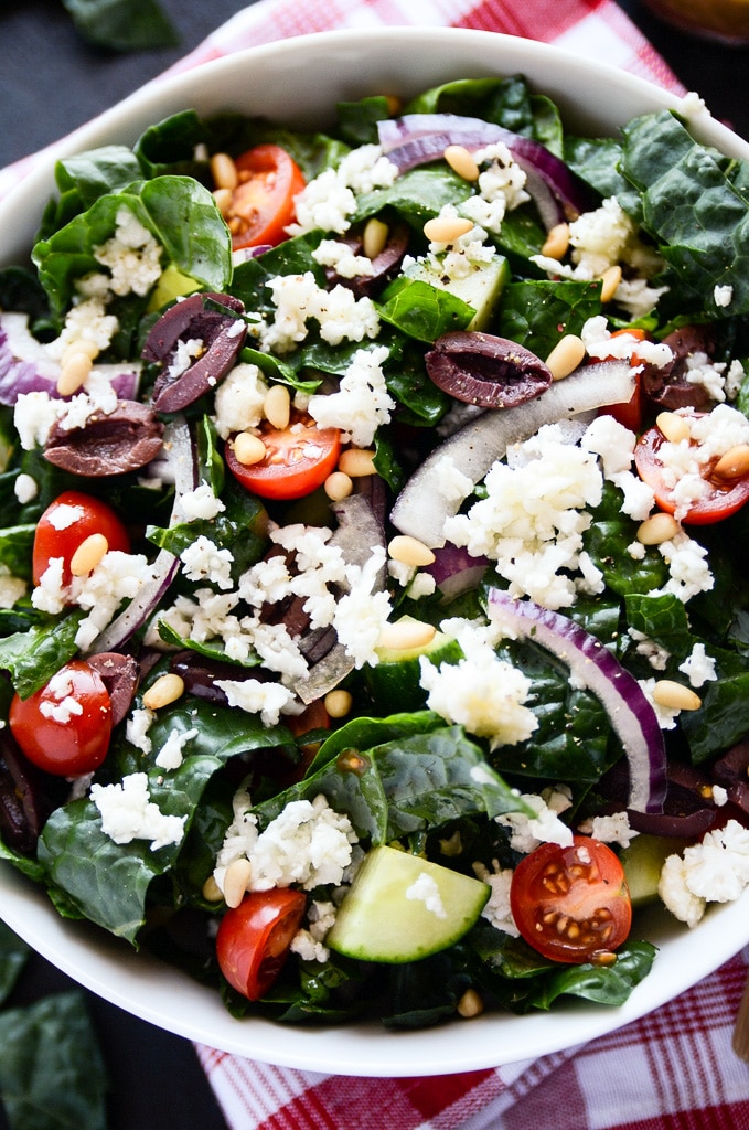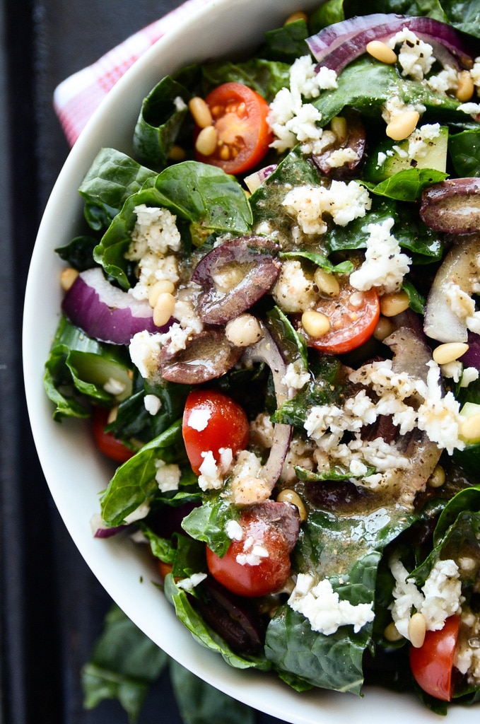 - Add the kale, cherry tomatoes, cucumber, red onion, olives, and pine nuts to a large bowl. Pour the dressing (see recipe below) over top, toss to coat, and divide the salad between two serving bowls.