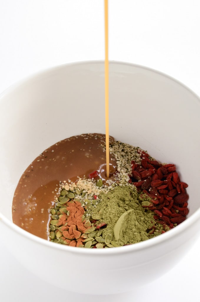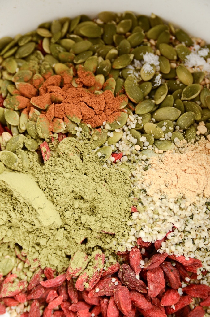 - Add the rolled oats, buckwheat groats, pumpkin seeds, hemp seeds, matcha powder, ginger, cinnamon, and sea salt to a large bowl.