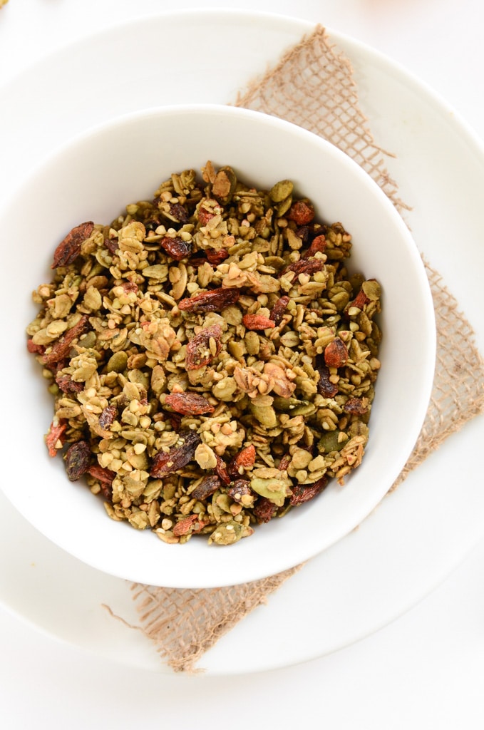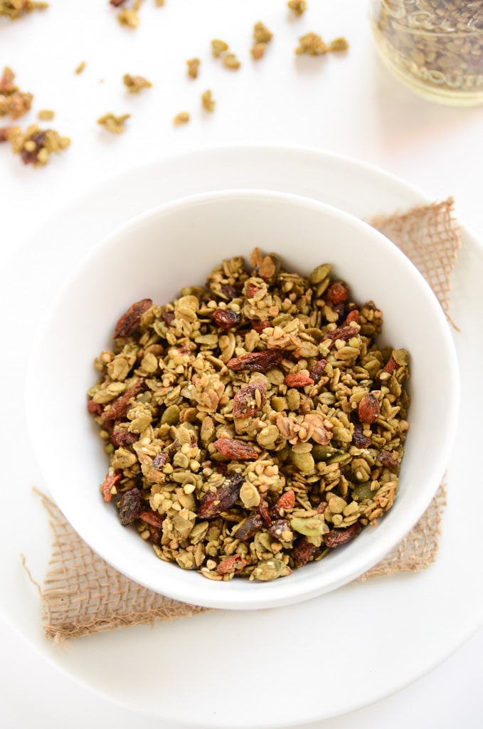 This flavorful vegan, gluten-free matcha green tea, buckwheat & goji granola comes together in a speedy 25 minutes flat. Rolled oats, buckwheat groats, pepitas, hemp seeds, matcha powder, ground ginger, cinnamon, and a pinch of sea salt are coated in a sweet glaze of maple syrup, coconut oil, tahini, and vanilla. The mixture is then spread out on a pan and baked to crispy perfection. Goji berries are mixed in after baking to lend an irresistibly sweet and chewy bite.