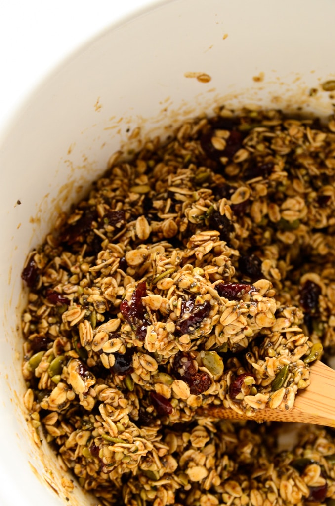 - Pour the almond butter mixture over the dry ingredients and gently stir together.