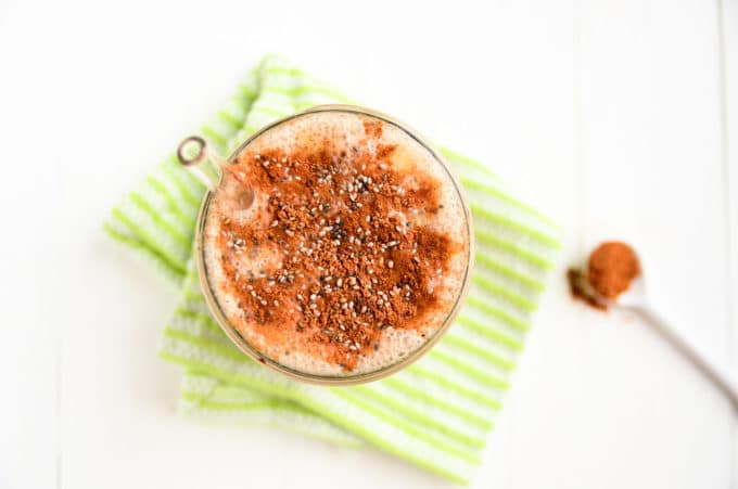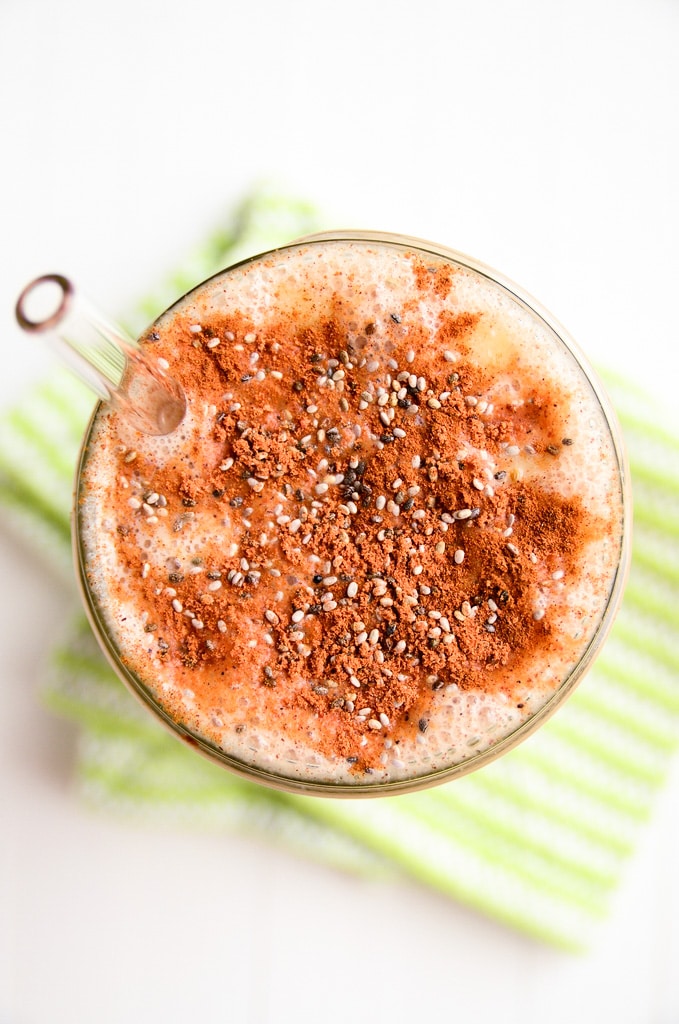 To make it, you'll simply toss a frozen banana or two, a peeled apple, almond milk, almond butter, cinnamon, and nutmeg into a blender. After blending to perfection in a quick minute, you'll pour this apple-cinnamon smoothie into a glass, and sprinkle with the toppings that suit your fancy. Chia seeds and cinnamon suited my fancy on the day I photographed this recipe, so there you have it.