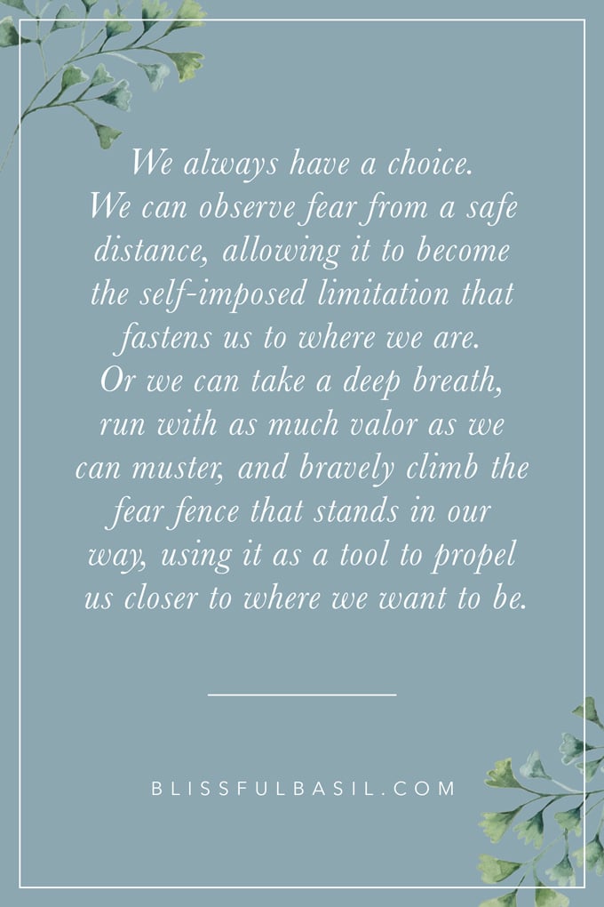 But then it dawned on me. What's on the other side of fear? FREEDOM. We always have a choice. We can observe fear from a safe distance, allowing it to become the self-imposed limitation that fastens us to where we are. Or we can take a deep breath, run forward with as much valor as we can muster, and bravely climb the fear fence that stands in our way, using it as a tool to propel us closer to where we want to be.