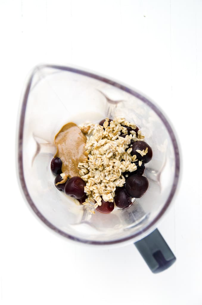 - Add the oats, banana, cherries, almond milk, and almond butter to a high-powered blender.