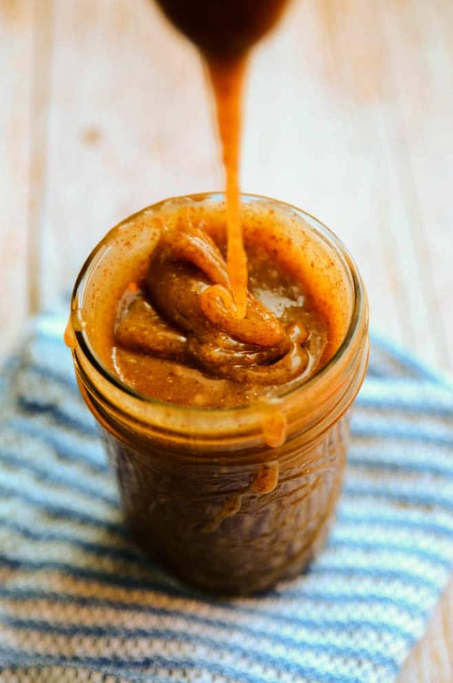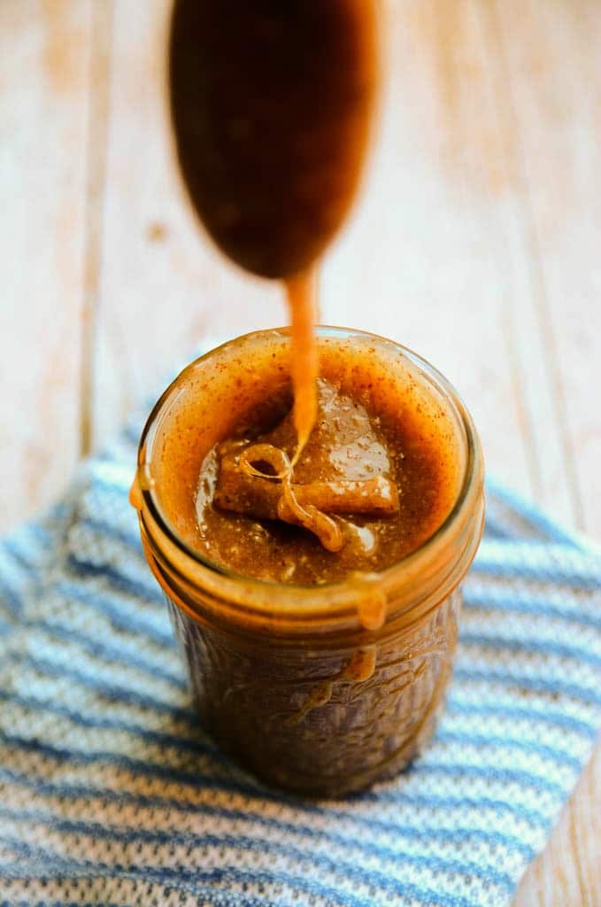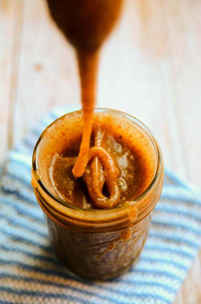 This caramel is made with five simple ingredients and comes together in no more than five minutes. Pure maple syrup, creamy raw almond butter, coconut oil, vanilla extract, and a pinch of salt are poured into a sauce pan and whisked together as they warm. The ingredients combine effortlessly to become everything it is that we love about caramel: drizzle-worthy, sticky, sweet, and buttery. As it cools to room temperature, it thickens up even more (the photos were taken after letting the mixture sit at room temperature for about 15 minutes), and after refrigerating it you'll have a super-thick, scoopable caramel that can be enjoyed as is or warmed back to a drizzly state.