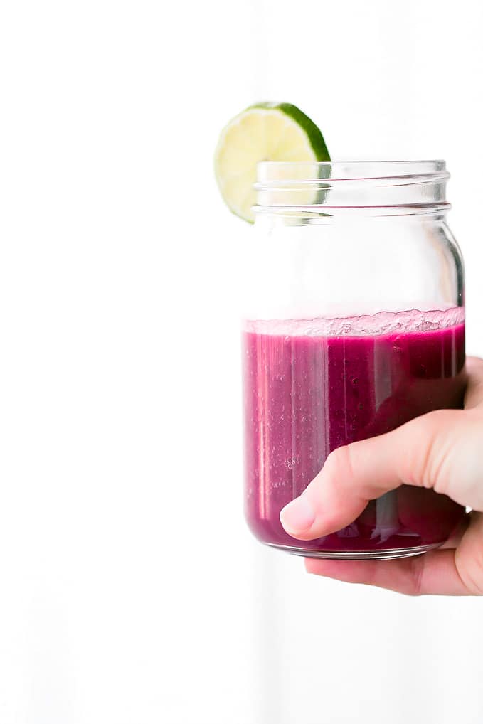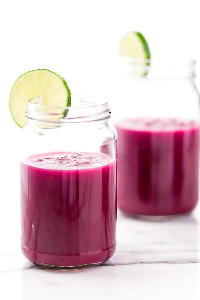 This powerful vegan beet-the-heat pink detox smoothie is home to an impressive lineup of feel-good fruits and veggies, including beet, green apple, pear, fennel, ginger, lemon juice, parsley, dates (for a touch of sweetness), and coconut water. Detoxifying, nourishing, and hydrating goodness all wrapped up in one (hot) pink package.
