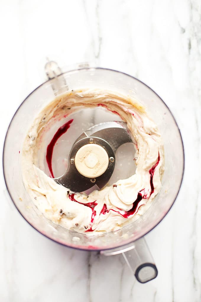 - Make the smoothie while the peppermint-beet syrup is cooling. Add the frozen bananas and plant-based milk to a food processor. Process until you have a smooth and creamy mixture that resembles soft serve ice cream, stopping to scrape down the sides as needed.