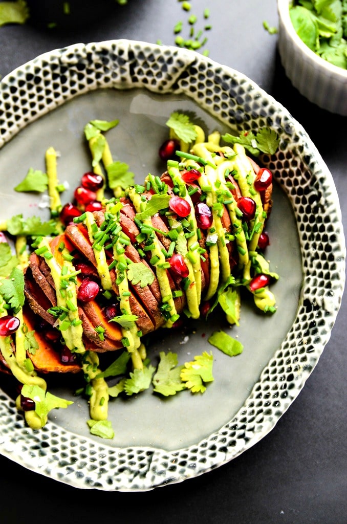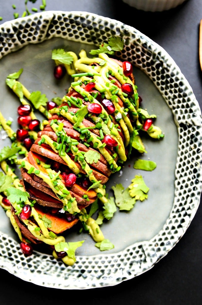 - Transfer each sweet potato to a plate. Pipe or dollop the avocado aioli on top of the sweet potatoes and sprinkle with pomegranate seeds, cilantro leaves, chives, and sea salt. Serve immediately.