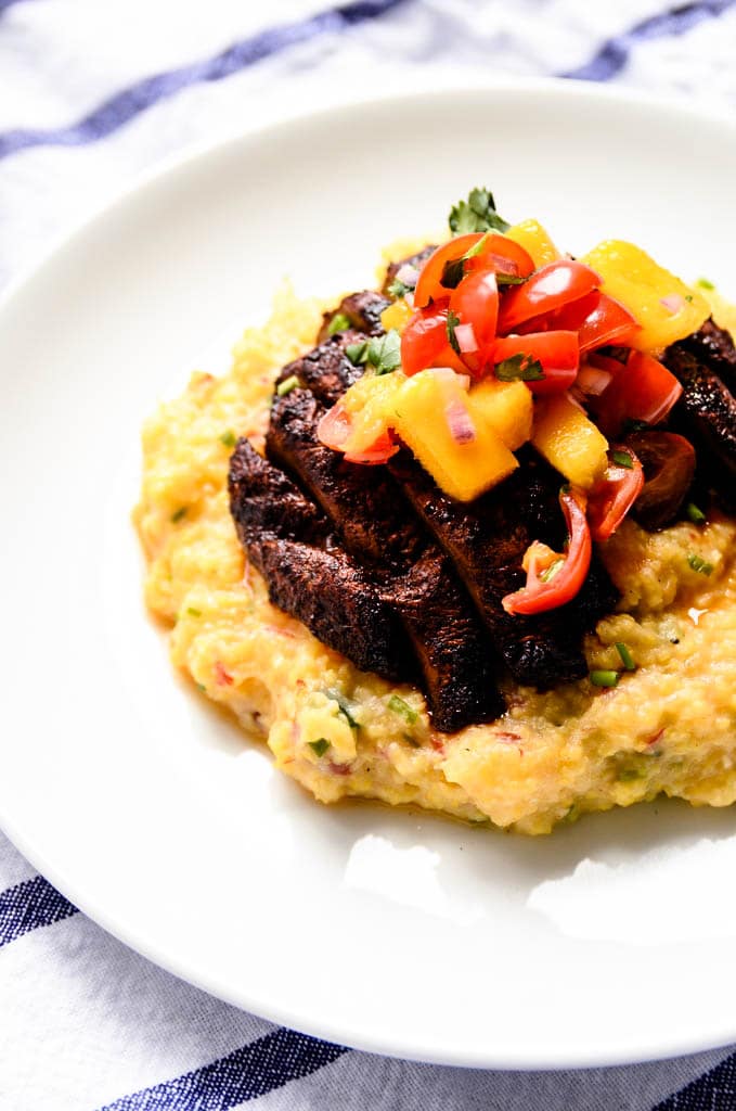 - Drop a mound of the polenta onto a plate, top with a sliced Portobello, and garnish with mango salsa (note: I added a lot more salsa to mine after photographing them). Repeat and serve.