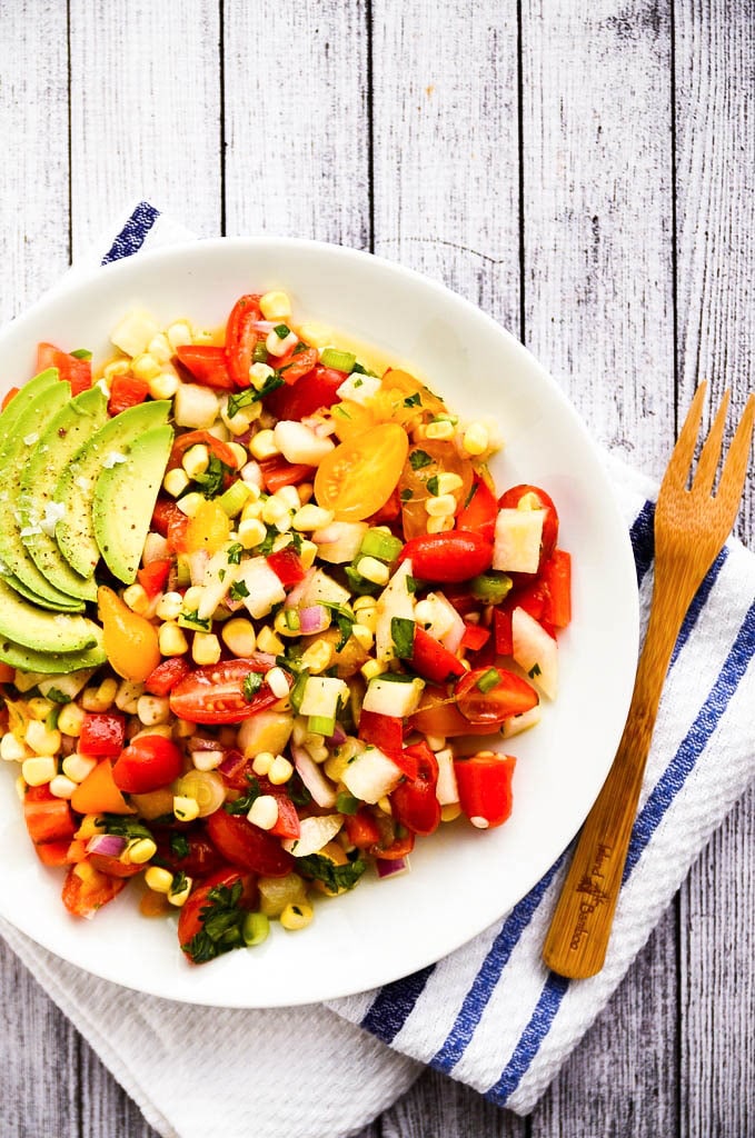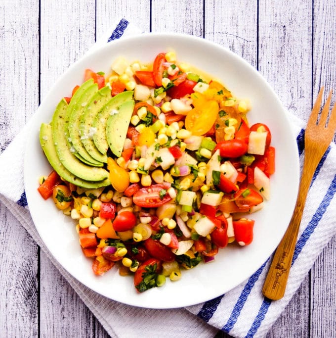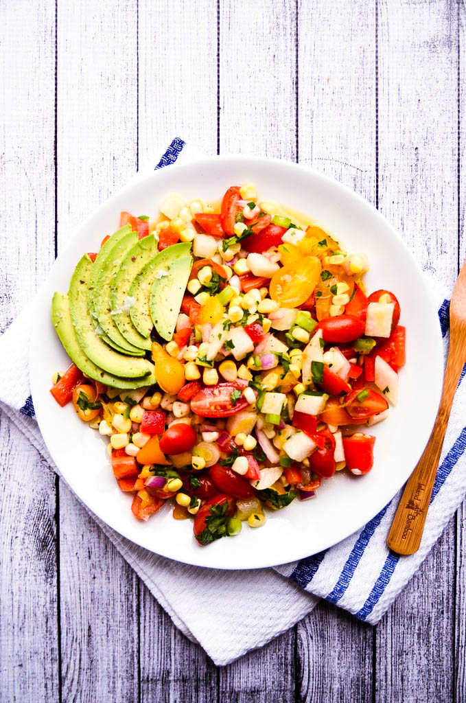 This vegan late spring vegetable ceviche is made with juicy grape tomatoes, fresh corn, crisp jicama, red pepper, silky mango, zesty red onion, and scallions. The mixture soaks for 2 to 3 hours in a citrus vinaigrette made with lime juice, orange juice, cilantro, serrano peppers, olive oil, and salt. As it marinates, the vegetables soften and become infused with the flavors from the vinaigrette. The result is a salad that looks like confetti and tastes like summer. The jicama adds this amazing crunch and the mango adds just a touch of sweetness to balance the citrus. The perfect summer side!