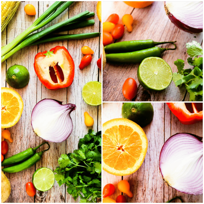 This vegan ceviche is made by combining grape tomatoes, fresh corn, jicama, red pepper, mango, red onion, and scallions. The vegetables (and one fruit) are then soaked for 2-3 hours in a citrus vinaigrette that's made by combining lime juice, orange juice, cilantro, serrano peppers, olive oil, and salt. As it marinates, the mixture becomes infused with all of the flavors from the vinaigrette.