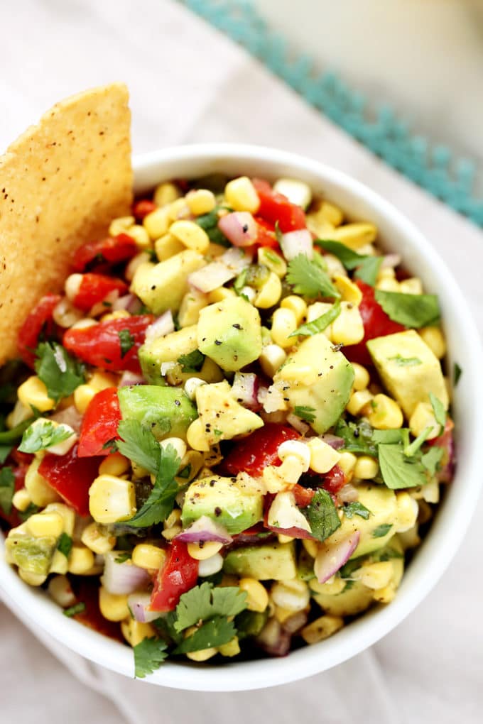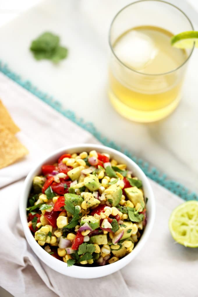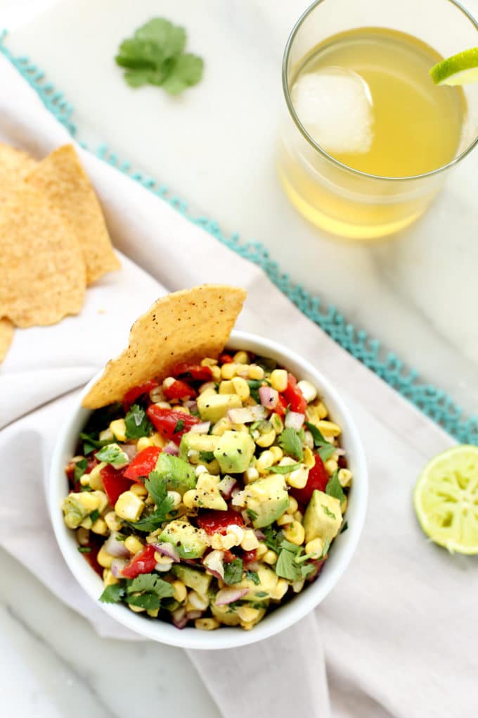 - Meanwhile, use a knife to slice down the length of each ear of corn and transfer to the mixing bowl. Add in the tomatoes, avocado, red onion, cilantro, lime juice, and sea salt. Toss to coat and serve alongside tortilla chips.