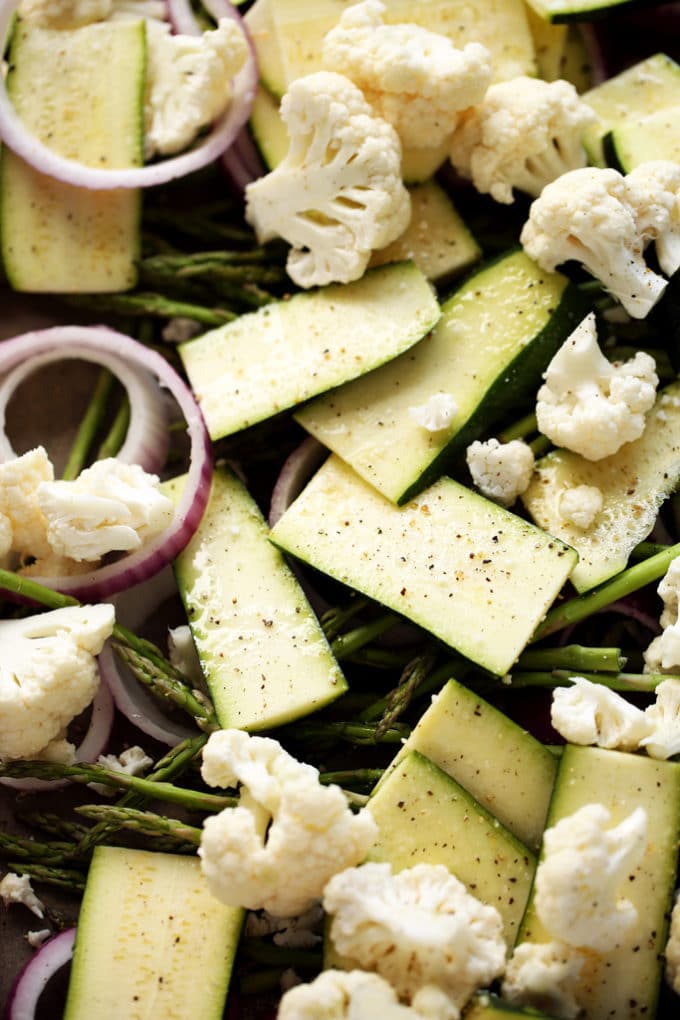 - Line a large baking pan with parchment paper. Spread the veggies out over the pan, drizzle with the oil, and season with salt and pepper. Roast for 45 minutes or until veggies are tender and golden, stopping to toss at the 20-minute mark.