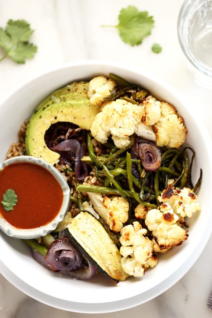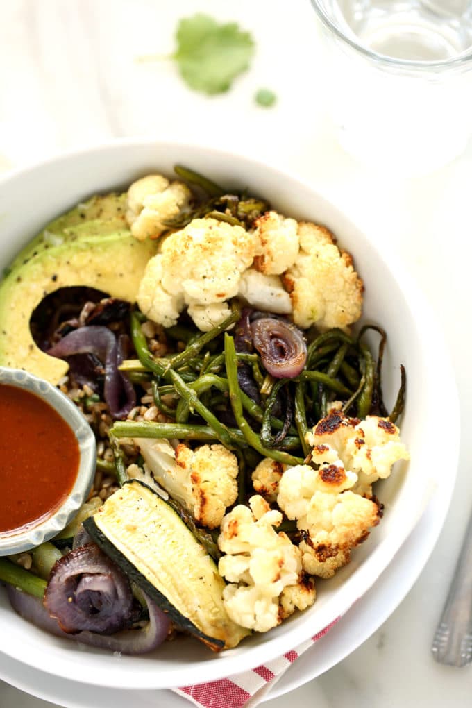 This roasted vegetable rainbow bowl gets a comforting, grill-weather twist with the addition of balsamic-splashed brown rice, tangy maple barbecue sauce, and sliced avocado. A little sweet, a little tang, a little smokiness, and just enough buttery avocado to bring balance to this addictive meal.